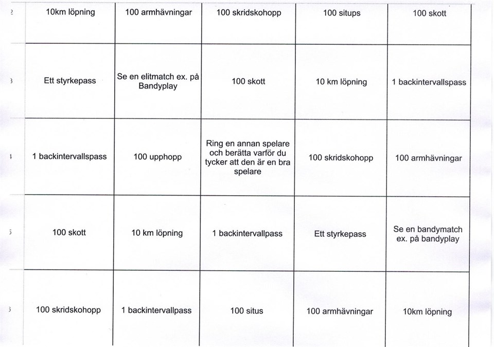 Var med och spela! Pandemin gör det svårt att träna gemensamt men det ska inte stoppa oss. Därför har vi satt ihop en bingo. Varje gång du utför en av uppgifterna på bingobrickan så sätter du ett kryss. Vi spelar om rader och full bricka. Först till full bricka vinner pris. Fina priser i potten. Du kan vinna på två sätt, 1 du fortsätter att utvecklas som atlet och spelare. 2 du kan vinna ett fint pris. Lycka till! // Sebbe